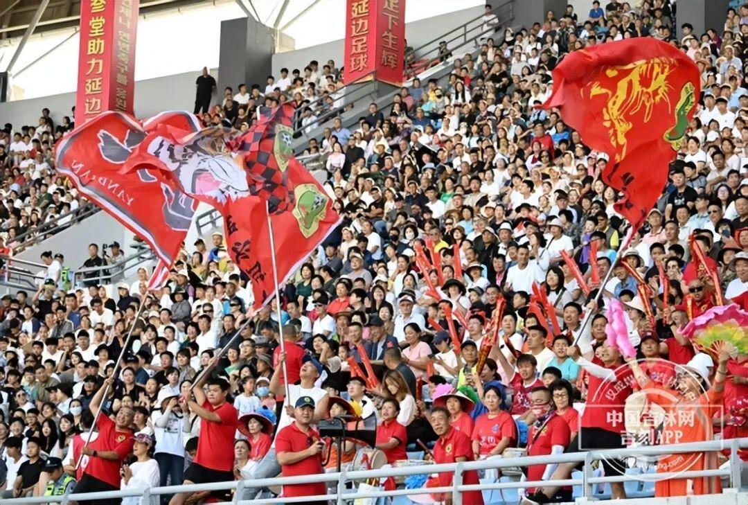 9月5日的延吉市全民健身中心体育场,变身欢乐的海洋!下午2点还没到,球迷就把看台坐得满满当当,挥舞着彩色旗帜、喊着加油口号——2025吉...